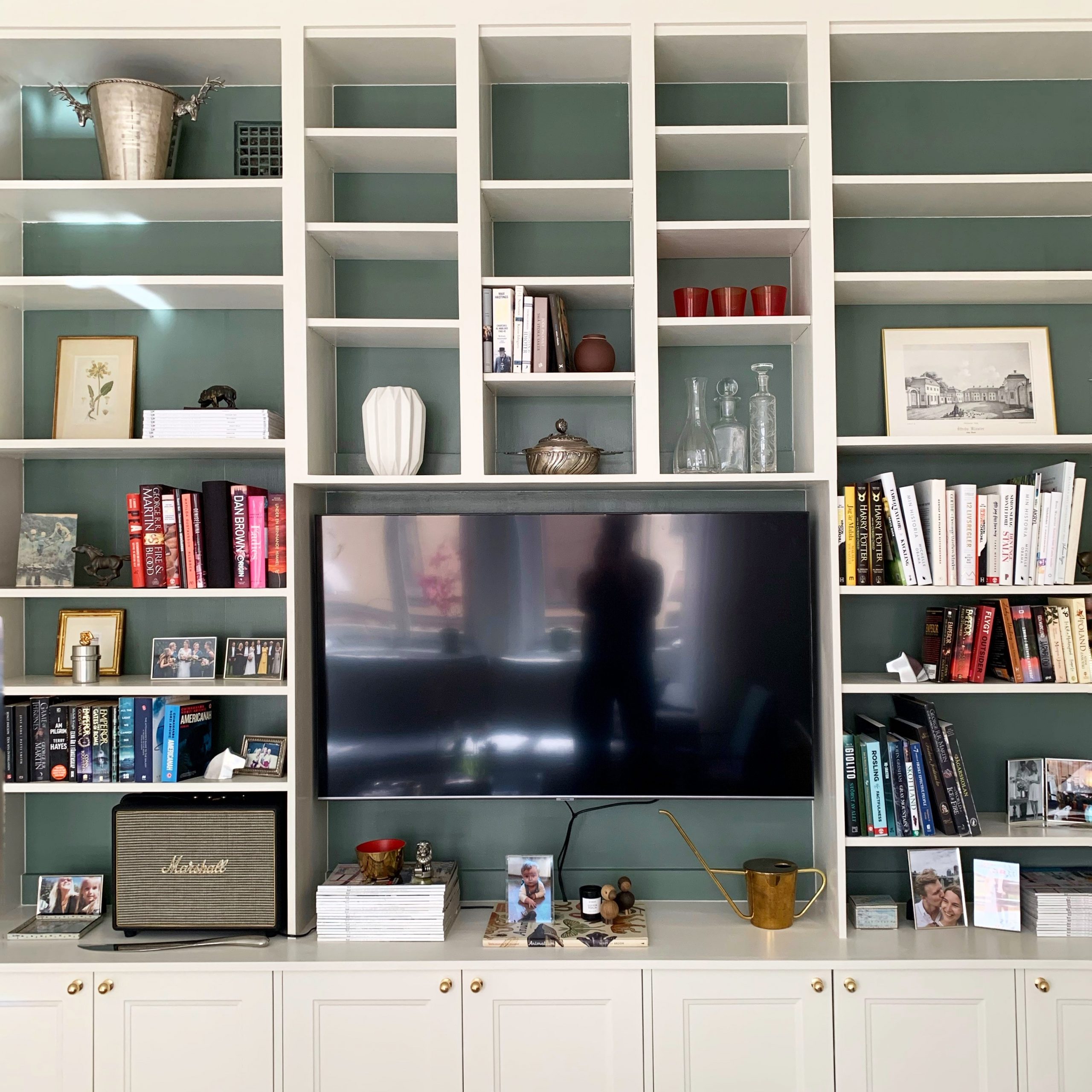 Platsbyggd bokhylla och tapetsering.