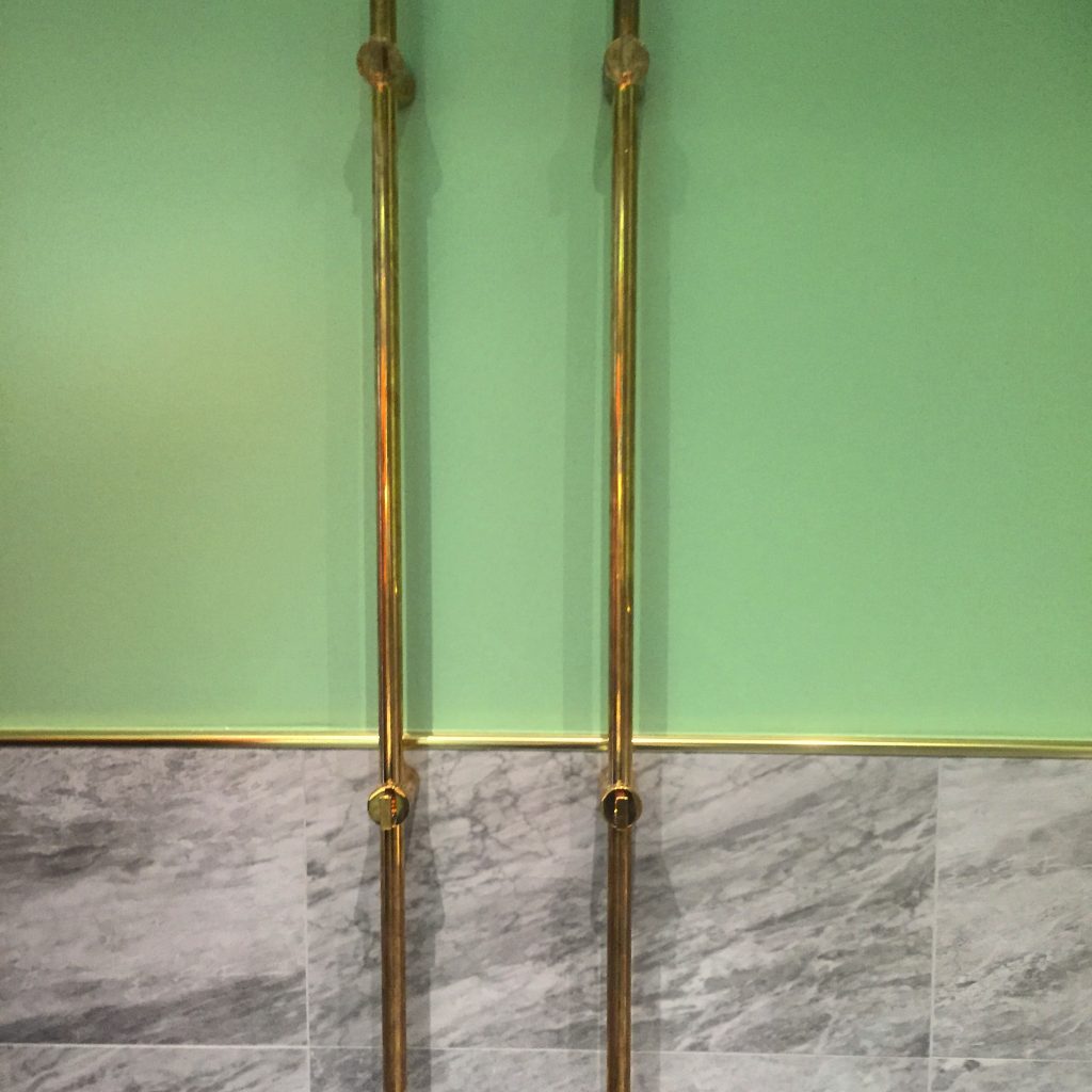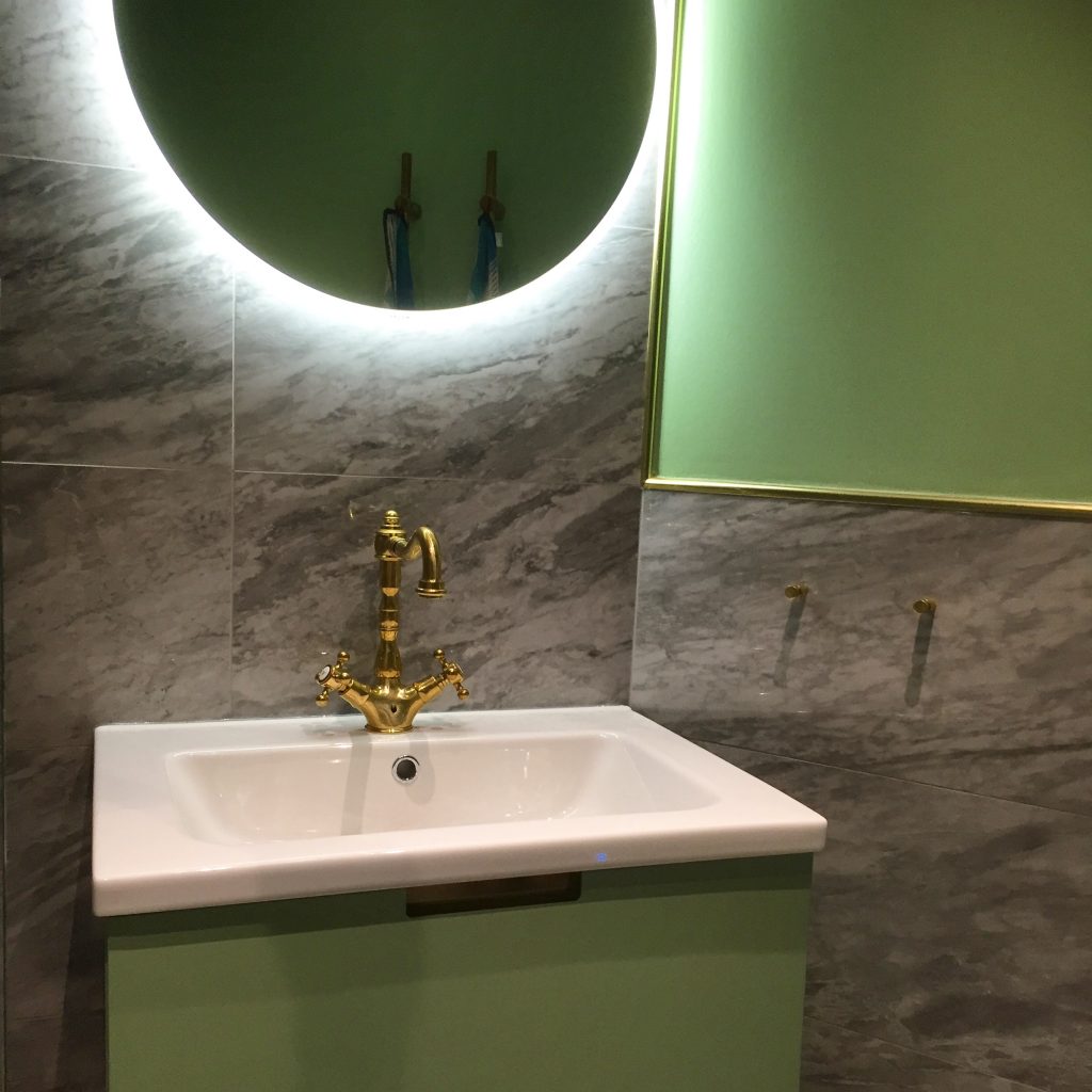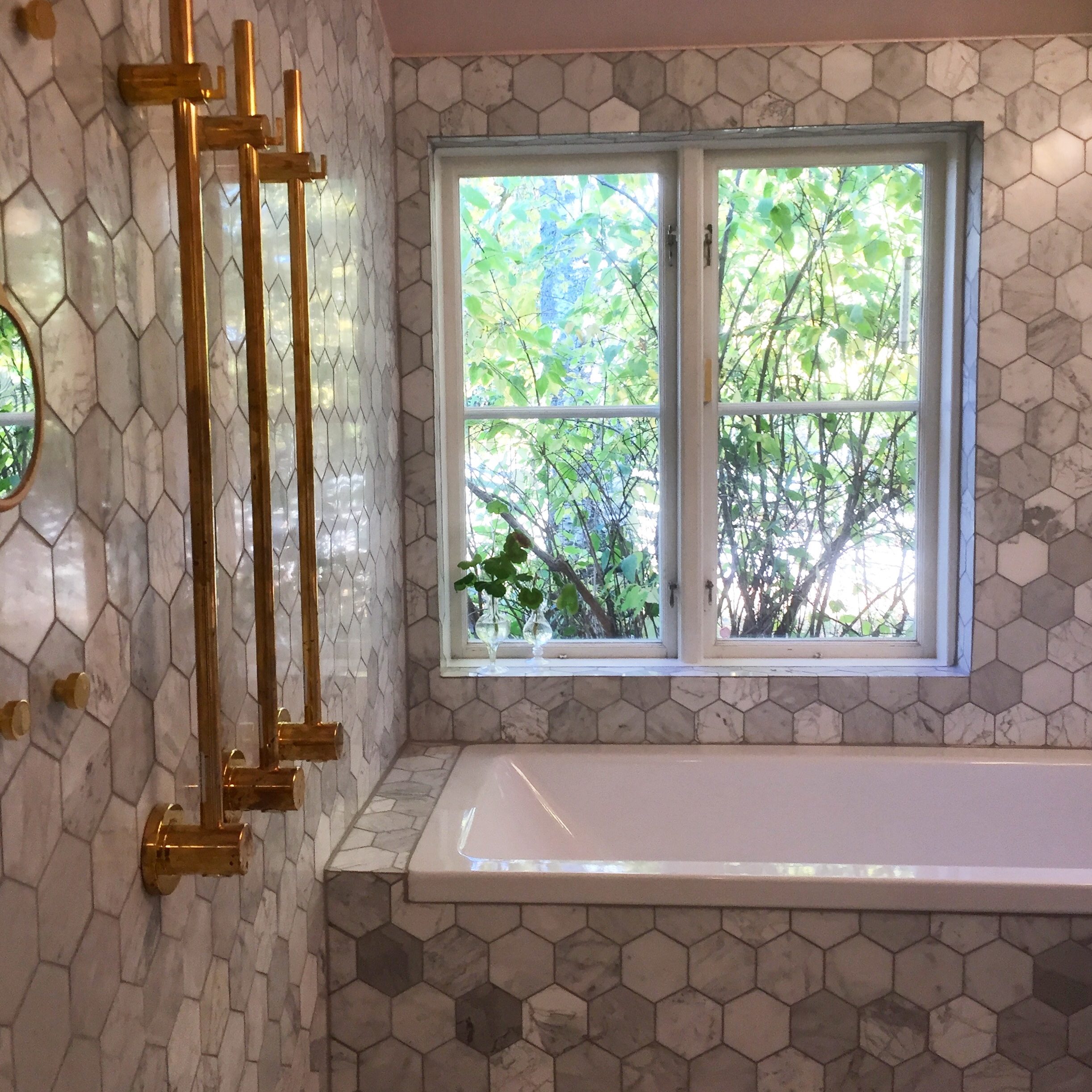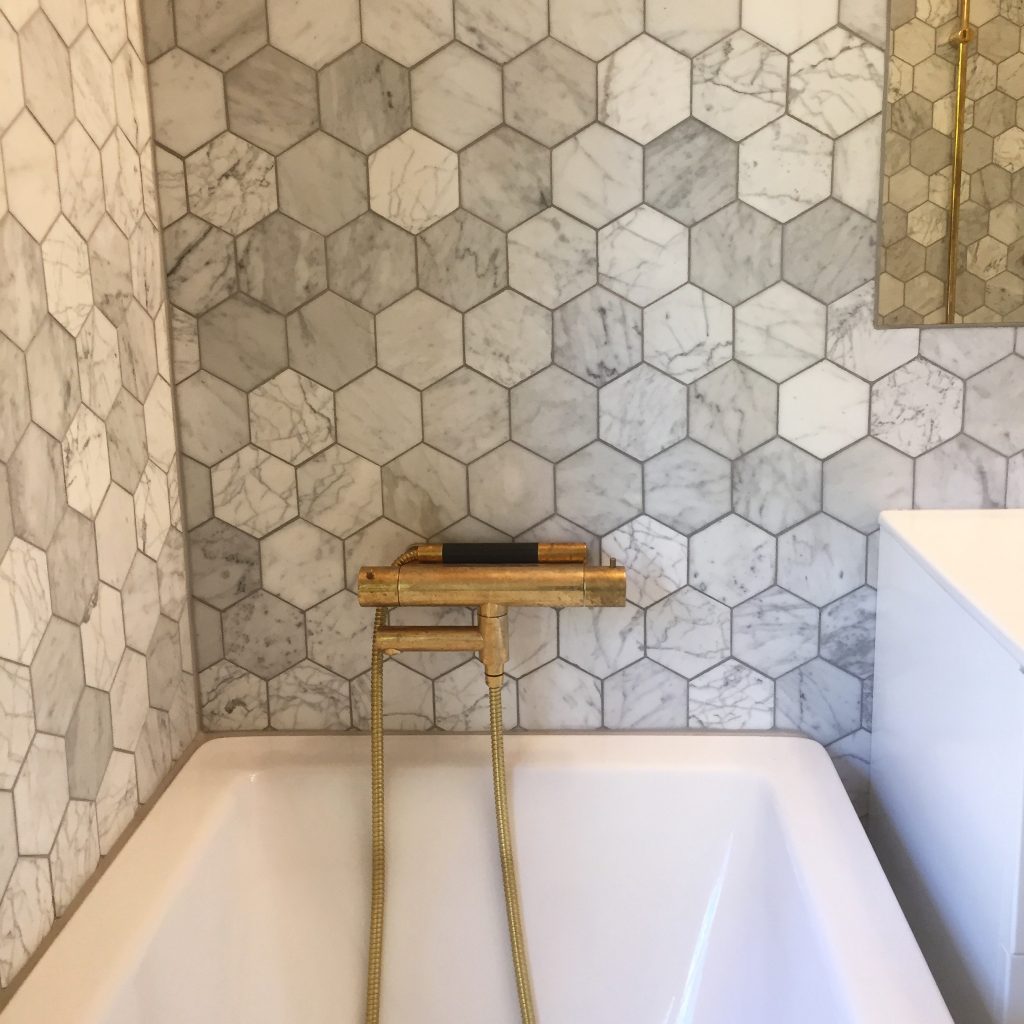 Badrum i hexagonmarmor med mässingsdetaljer
