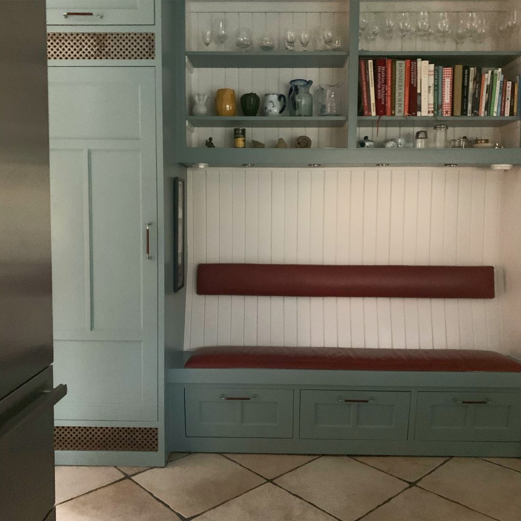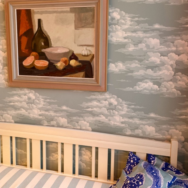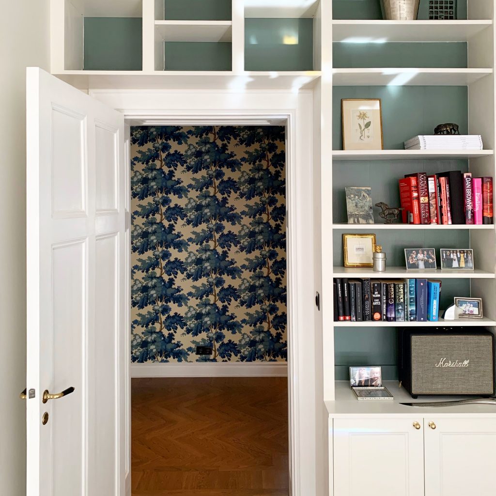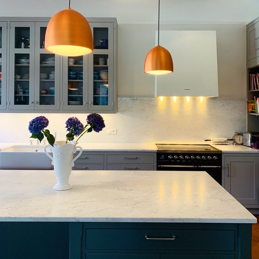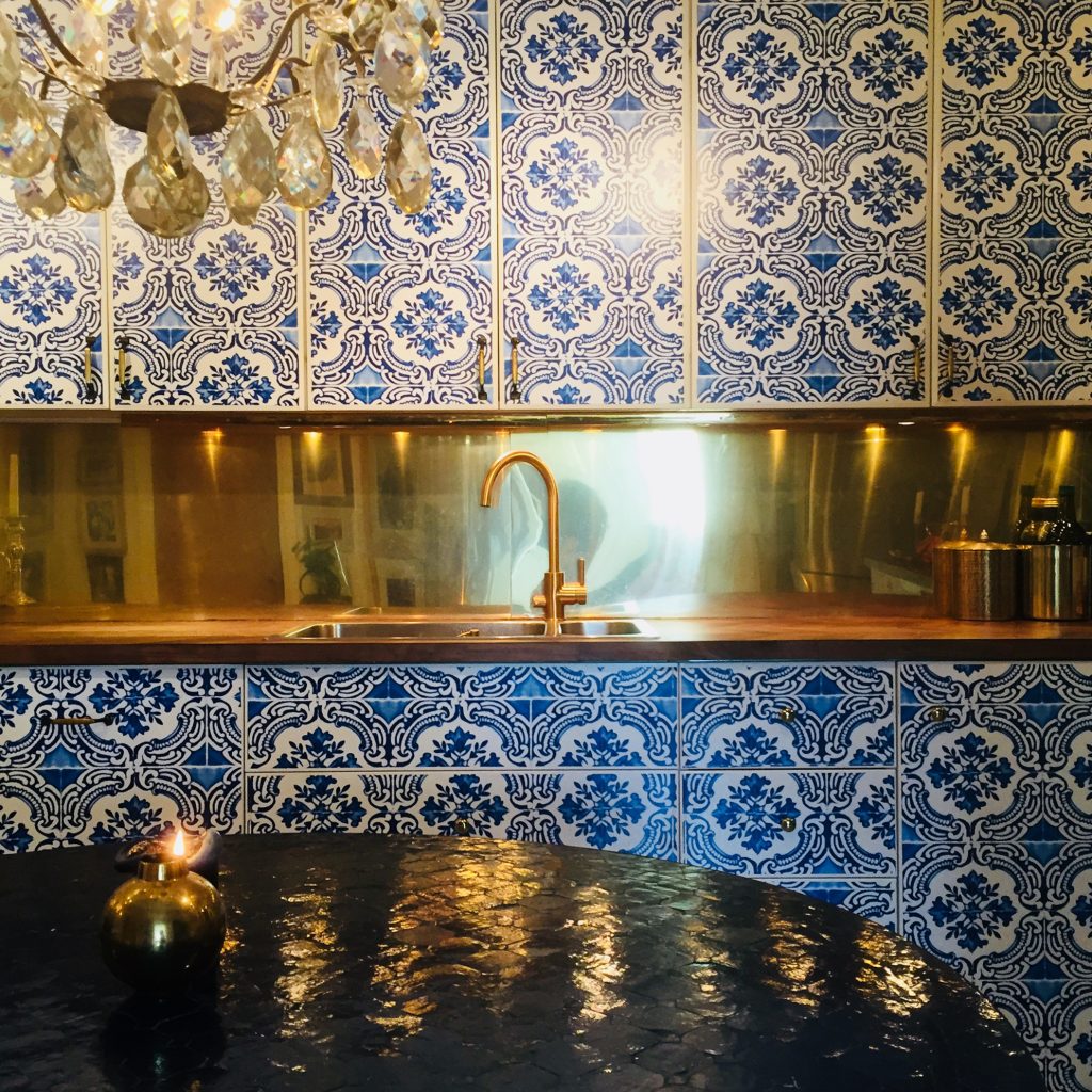 Kök med tapetserade luckor och stänkskydd i mässing