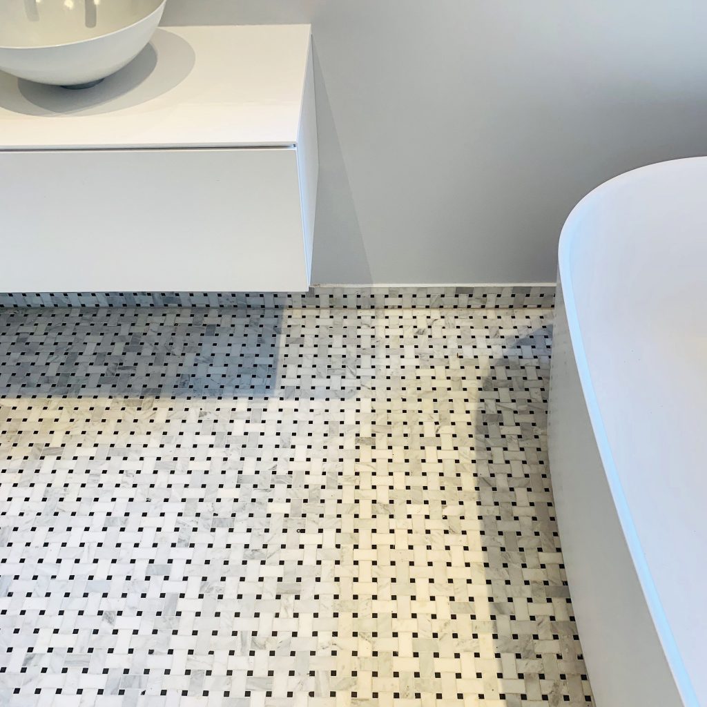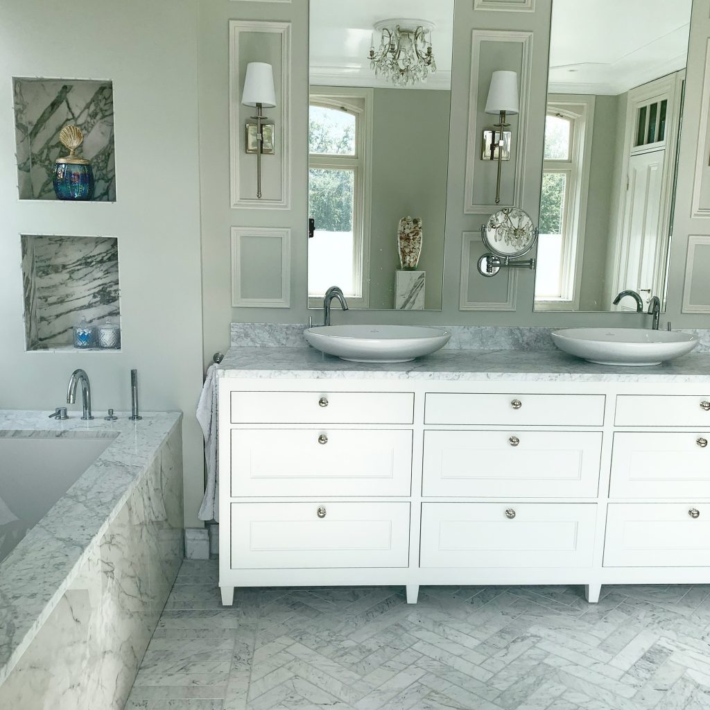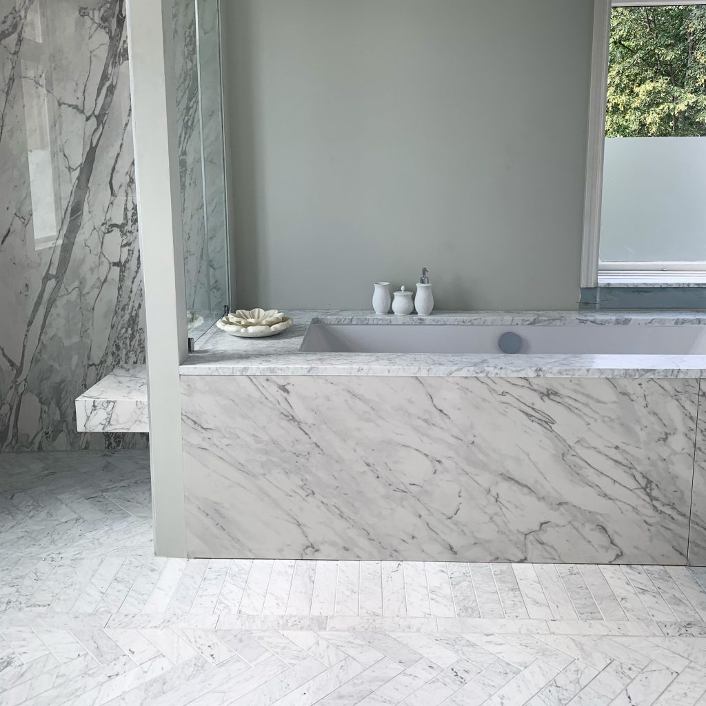 Badrum i Carrara-marmor och fiskbensmönster i marmor